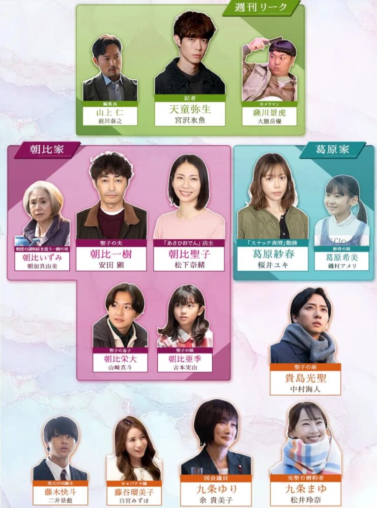 何やら怪しいのが紗春。桜井ユキさんが時にとっても怪しく怖い表情を見せています。聖子の弟役の中村海人さんのフレッシュな演技がまたピカリと光っています。ほか、しつこさが怖さにも感じる週刊誌記者役の宮沢永魚さん、ベテランの演技を見せる朝加真由美さんら松下奈緒さんを囲む豪華キャストの演技は大きな見どころになっています。