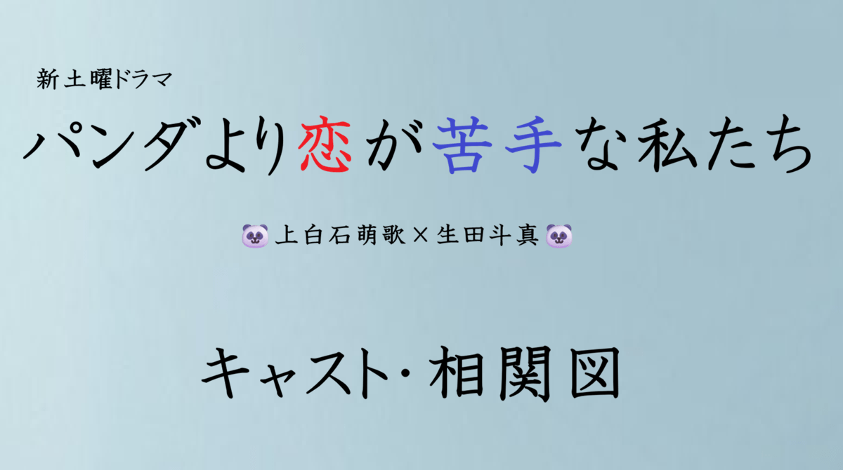 本記事ではドラマ【パンダより恋が苦手な私たち】のキャスト・登場人物・相関図・内容・見どころ・スタッフ・放送日を紹介します。